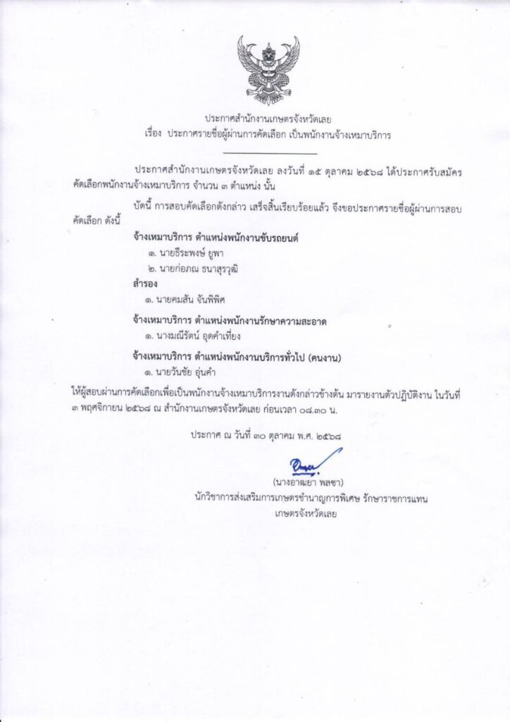 ประกาศสำนักงานเกษตรจังหวัดเลย เรื่อง ประกาศรายชื่อผู้ผ่านการคัดเลือก เป็นพนักงานจ้างเหมาบริการBy admin_doae / 18 ธันวาคม 2025