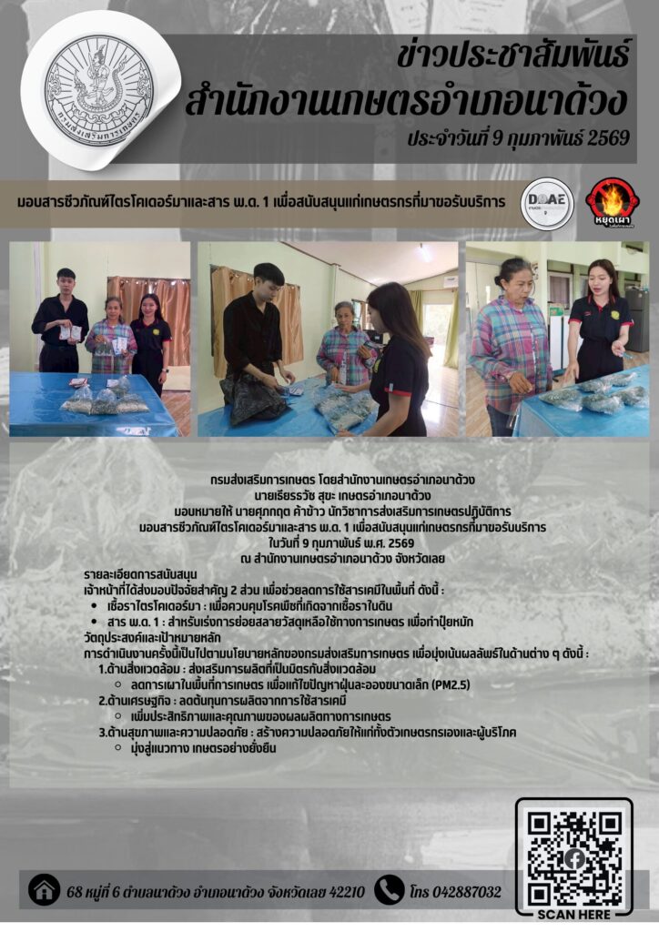 มอบสารชีวภัณฑ์ไตรโคเดอร์มาและสาร พ.ด. 1 เพื่อสนับสนุนแก่เกษตรกรที่มาขอรับบริการ