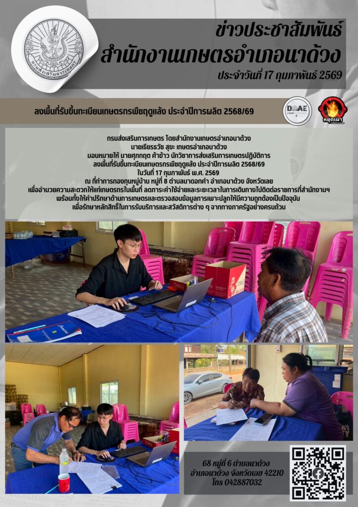 ลงพื้นที่รับขึ้นทะเบียนเกษตรกรพืชฤดูแล้ง ประจำปีการผลิต 2568/69