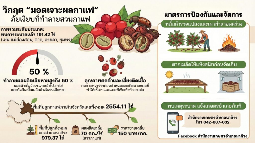 ขณะนี้มีการตรวจพบการระบาดของ มอดเจาะผลกาแฟ ในหลายพื้นที่ของประเทศไทย ซึ่งเป็นศัตรูพืชตัวฉกาจที่สามารถสร้างความเสียหายต่อผลผลิตได้สูงถึง 50% หากปล่อยไว้จะทำให้ผลกาแฟร่วงหล่น ติดเชื้อรา และเสียคุณภาพอย่างมาก