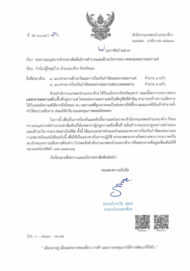 ประกาศด่วน! เฝ้าระวัง “มอดเจาะผลกาแฟ” ระบาดในพื้นที่ ☕️🐜ถึงพี่น้องเกษตรกรผู้ปลูกกาแฟในอำเภอนาด้วง จังหวัดเลย ทุกท่าน