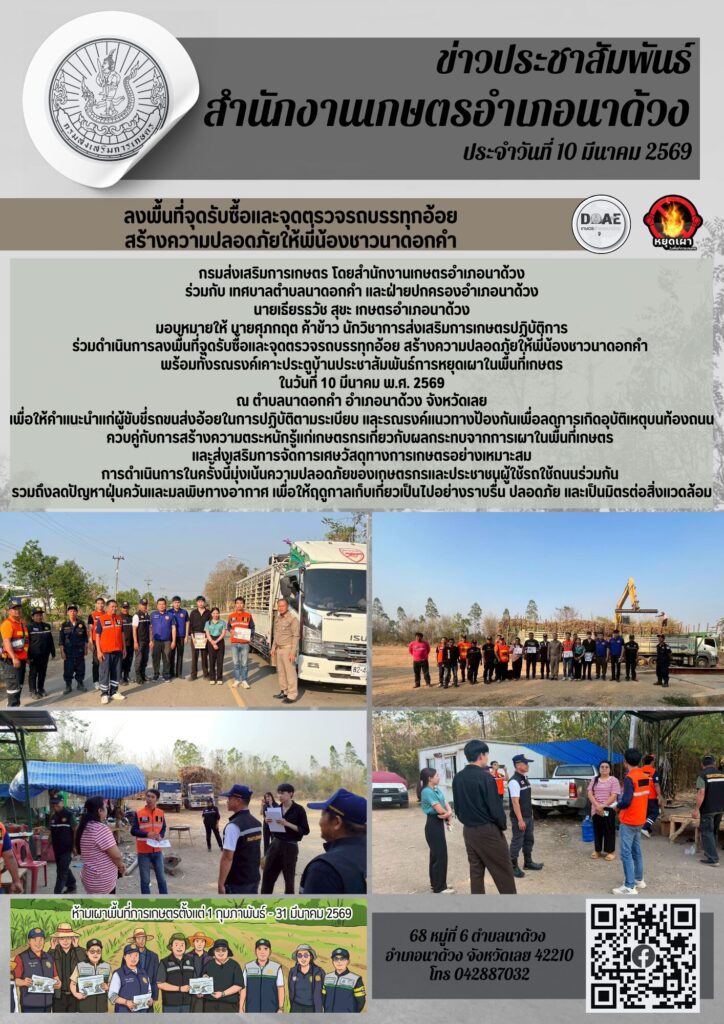 ร่วมดำเนินการลงพื้นที่จุดรับซื้อและจุดตรวจรถบรรทุกอ้อย สร้างความปลอดภัยให้พี่น้องชาวนาดอกคำ พร้อมทั้งรณรงค์เคาะประตูบ้านประชาสัมพันธ์การหยุดเผาในพื้นที่เกษตร