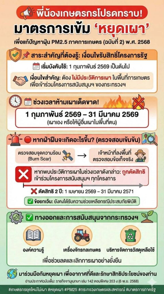 หากตรวจพบประวัติการเผาในช่วงเวลาดังกล่าว เกษตรกรจะ ถูกระงับสิทธิ์รับความช่วยเหลือจากภาครัฐเป็นเวลา 2 ปีเต็ม (1 เม.ย. 2569 – 31 มี.ค. 2571) ดังนี้: