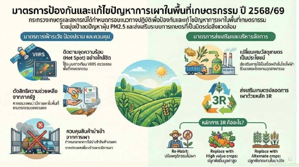 ข้อควรระวัง: การเผาในที่โล่ง/เขตชุมชน นอกจากจะเสียสิทธิ์เกษตรกรแล้ว ยังมีความผิดตามกฎหมายสาธารณสุขและระเบียบท้องถิ่น ซึ่งมีโทษปรับสูง