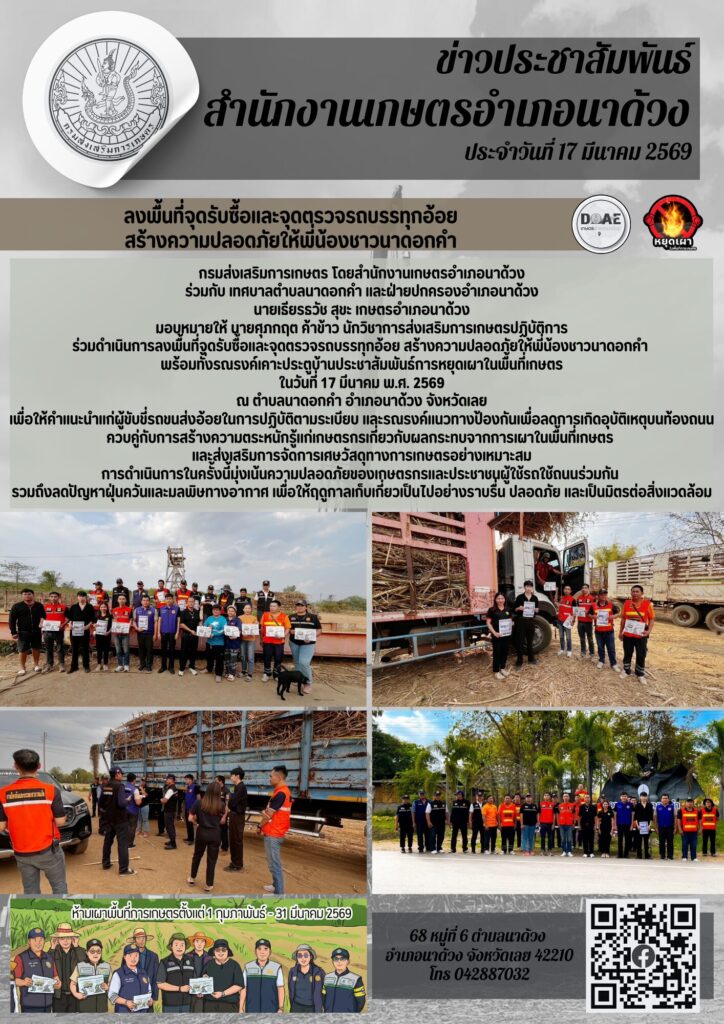 ร่วมดำเนินการลงพื้นที่จุดรับซื้อและจุดตรวจรถบรรทุกอ้อย สร้างความปลอดภัยให้พี่น้องชาวนาดอกคำ พร้อมทั้งรณรงค์เคาะประตูบ้านประชาสัมพันธ์การหยุดเผาในพื้นที่เกษตร