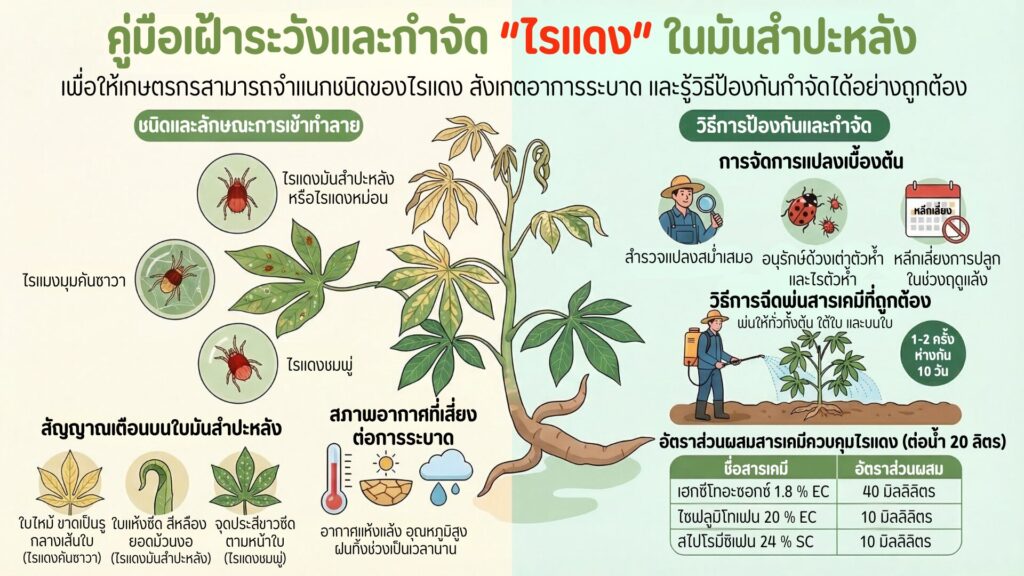 ช่วงอากาศร้อนและแห้งแล้งแบบนี้ เป็นเวลาทองของ “ไรแดง” ศัตรูตัวฉกาจที่ทำให้ผลผลิตมันสำปะหลังเสียหาย สำนักงานเกษตรอำเภอนาด้วงจึงขอแนะนำวิธีการเฝ้าระวังและกำจัด ดังนี้ครับ