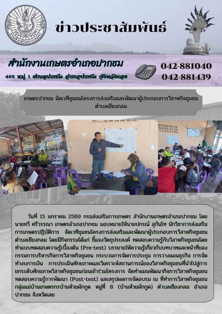 เกษตรปากชม จัดเวทีชุมชนโครงการส่งเสริมและพัฒนาผู้ประกอบการวิสาหกิจชุมชน ตำบลเชียงกลมBy admin_pakchom / 13 กุมภาพันธ์ 2026