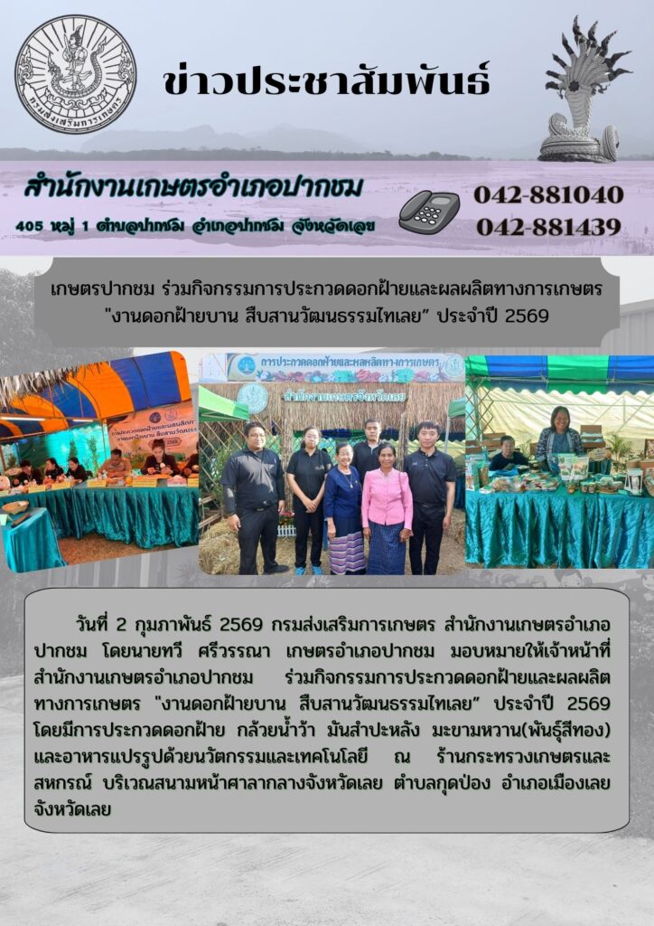 เกษตรปากชม ร่วมกิจกรรมการประกวดดอกฝ้ายและผลผลิตทางการเกษตร “งานดอกฝ้ายบาน สืบสานวัฒนธรรมไทเลย” ประจำปี 2569By admin_pakchom / 13 กุมภาพันธ์ 2026