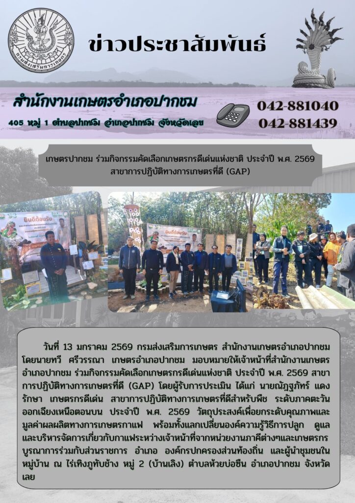 เกษตรปากชม ร่วมกิจกรรมคัดเลือกเกษตรกรดีเด่นแห่งชาติ ประจำปี พ.ศ. 2569 สาขาการปฏิบัติทางการเกษตรที่ดี (GAP)By admin_pakchom / 13 กุมภาพันธ์ 2026