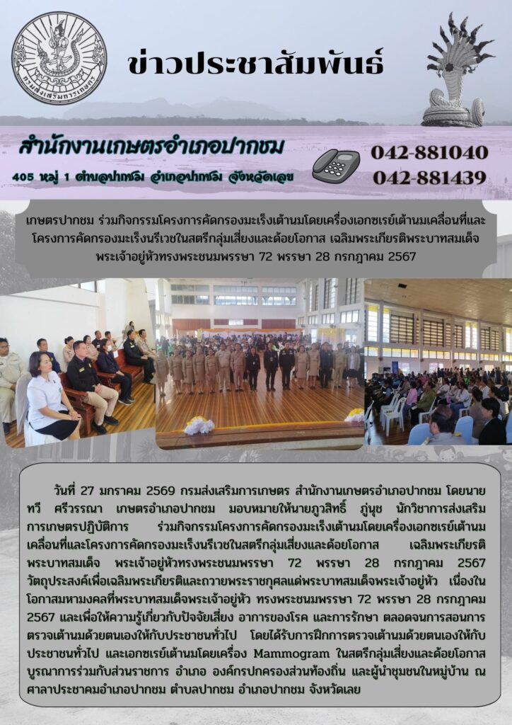 เกษตรปากชม ร่วมกิจกรรมโครงการคัดกรองมะเร็งเต้านมโดยเครื่องเอกซเรย์เต้านมเคลื่อนที่และโครงการคัดกรองมะเร็งนรีเวชในสตรีกลุ่มเสี่ยงและด้อยโอกาส เฉลิมพระเกียรติพระบาทสมเด็จ พระเจ้าอยู่หัวทรงพระชนมพรรษา 72 พรรษา 28 กรกฎาคม 2567By admin_pakchom / 13 กุมภาพันธ์ 2026