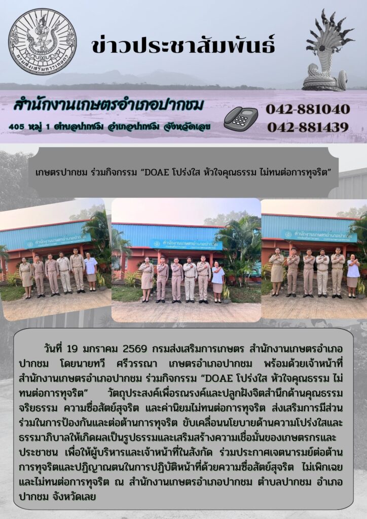 เกษตรปากชม ร่วมกิจกรรม “DOAE โปร่งใส หัวใจคุณธรรม ไม่ทนต่อการทุจริต”By admin_pakchom / 13 กุมภาพันธ์ 2026