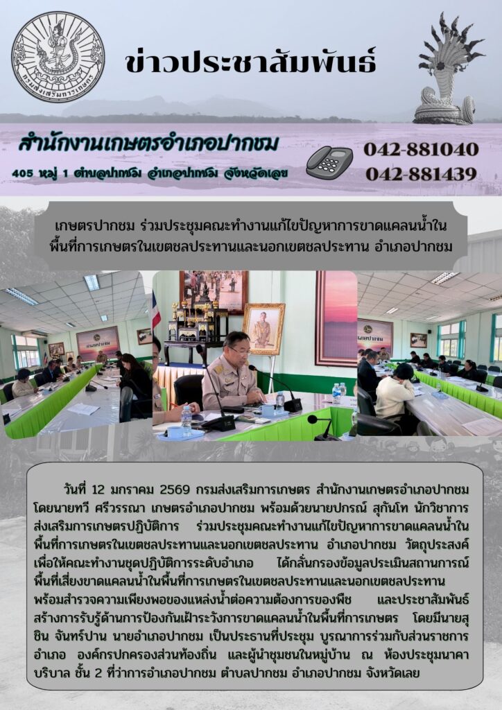 เกษตรปากชม ร่วมประชุมคณะทำงานแก้ไขปัญหาการขาดแคลนน้ำในพื้นที่การเกษตรในเขตชลประทานและนอกเขตชลประทาน อำเภอปากชมBy admin_pakchom / 13 กุมภาพันธ์ 2026