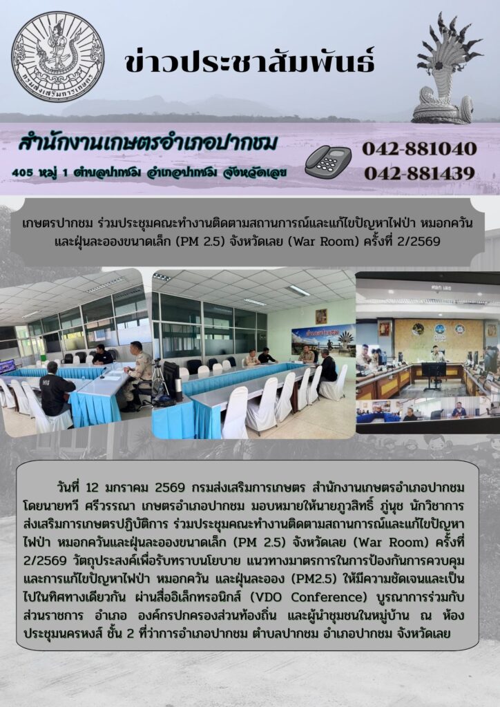 เกษตรปากชม ร่วมประชุมคณะทำงานติดตามสถานการณ์และแก้ไขปัญหาไฟป่า หมอกควันและฝุ่นละอองขนาดเล็ก (PM 2.5) จังหวัดเลย (War Room) ครั้งที่ 2/2569By admin_pakchom / 13 กุมภาพันธ์ 2026