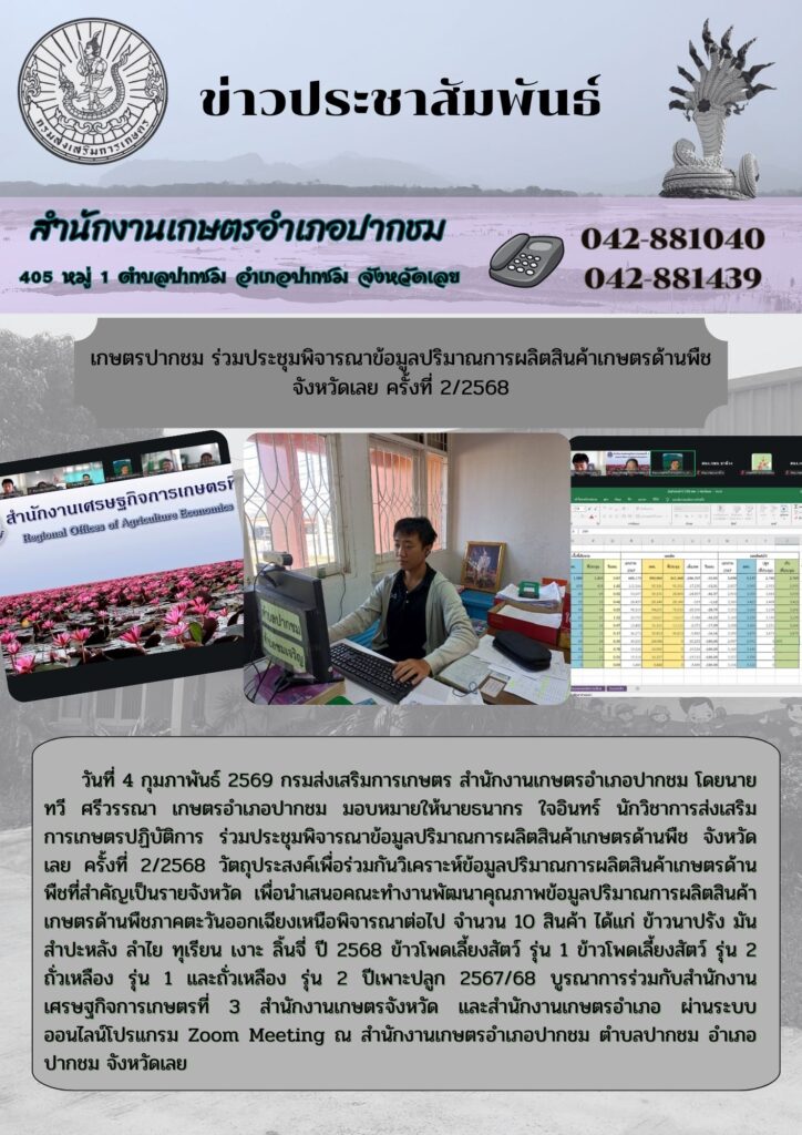 เกษตรปากชม ร่วมประชุมพิจารณาข้อมูลปริมาณการผลิตสินค้าเกษตรด้านพืช จังหวัดเลย ครั้งที่ 2/2568By admin_pakchom / 13 กุมภาพันธ์ 2026