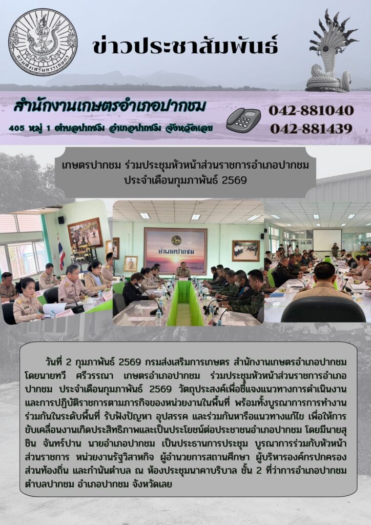 เกษตรปากชม ร่วมประชุมหัวหน้าส่วนราชการอำเภอปากชม ประจำเดือนกุมภาพันธ์ 2569By admin_pakchom / 13 กุมภาพันธ์ 2026