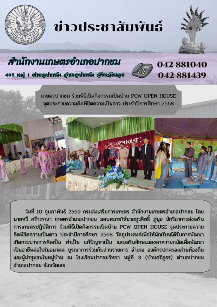 เกษตรปากชม ร่วมพิธีเปิดกิจกรรมเปิดบ้าน PCW OPEN HOUSE จุดประกายความคิดพิชิตความเป็นดาว ประจำปีการศึกษา 2568By admin_pakchom / 13 กุมภาพันธ์ 2026