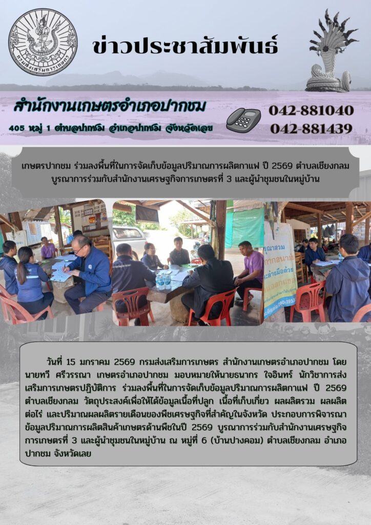 เกษตรปากชม ร่วมลงพื้นที่ในการจัดเก็บข้อมูลปริมาณการผลิตกาแฟ ปี 2569 ตำบลเชียงกลม บูรณาการร่วมกับสำนักงานเศรษฐกิจการเกษตรที่ 3 และผู้นำชุมชนในหมู่บ้านBy admin_pakchom / 13 กุมภาพันธ์ 2026