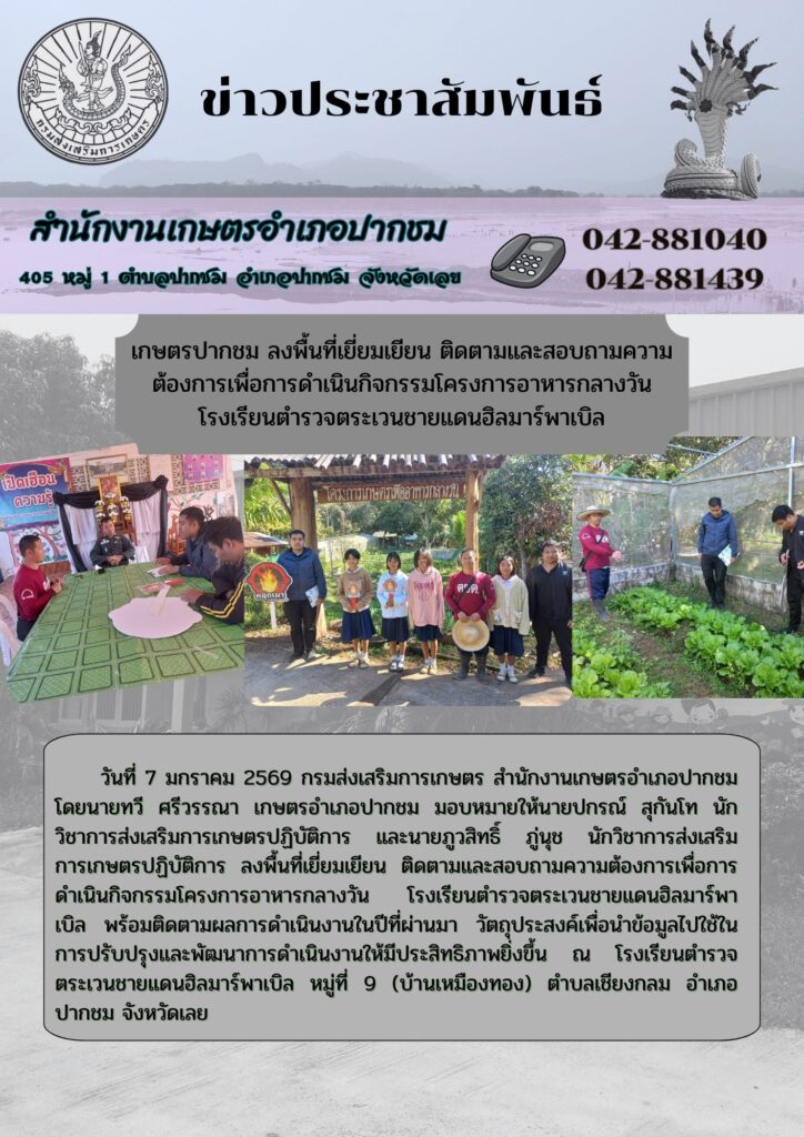 เกษตรปากชม ลงพื้นที่เยี่ยมเยียน ติดตามและสอบถามความต้องการเพื่อการดำเนินกิจกรรมโครงการอาหารกลางวัน โรงเรียนตำรวจตระเวนชายแดนฮิลมาร์พาเบิลBy admin_pakchom / 13 กุมภาพันธ์ 2026