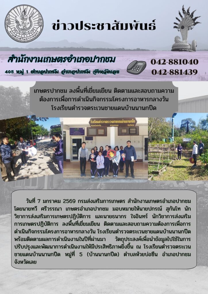 เกษตรปากชม ลงพื้นที่เยี่ยมเยียน ติดตามและสอบถามความต้องการเพื่อการดำเนินกิจกรรมโครงการอาหารกลางวัน โรงเรียนตำรวจตระเวนชายแดนบ้านนานกปีดBy admin_pakchom / 13 กุมภาพันธ์ 2026