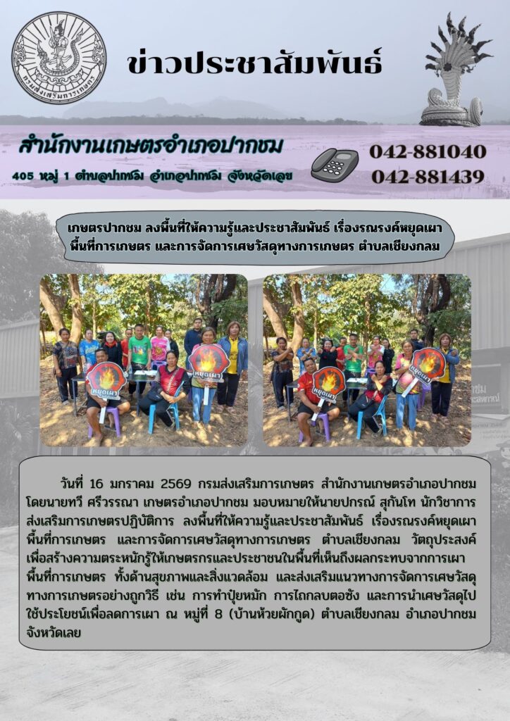 เกษตรปากชม ลงพื้นที่ให้ความรู้และประชาสัมพันธ์ เรื่องรณรงค์หยุดเผาพื้นที่การเกษตร และการจัดการเศษวัสดุทางการเกษตร ตำบลเชียงกลมBy admin_pakchom / 13 กุมภาพันธ์ 2026