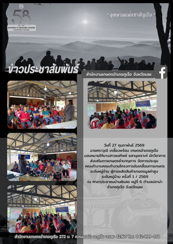 จัดการประชุมคณะทำงานคณะทำงานโครงการขับเคลื่อนการเกษตรระดับหมู่บ้าน สู่การผลิตสินค้าเกษตรมูลค่าสูงระดับหมู่บ้าน ครั้งที่ 1 / 2569By admin_phuruea / 13 มีนาคม 2026