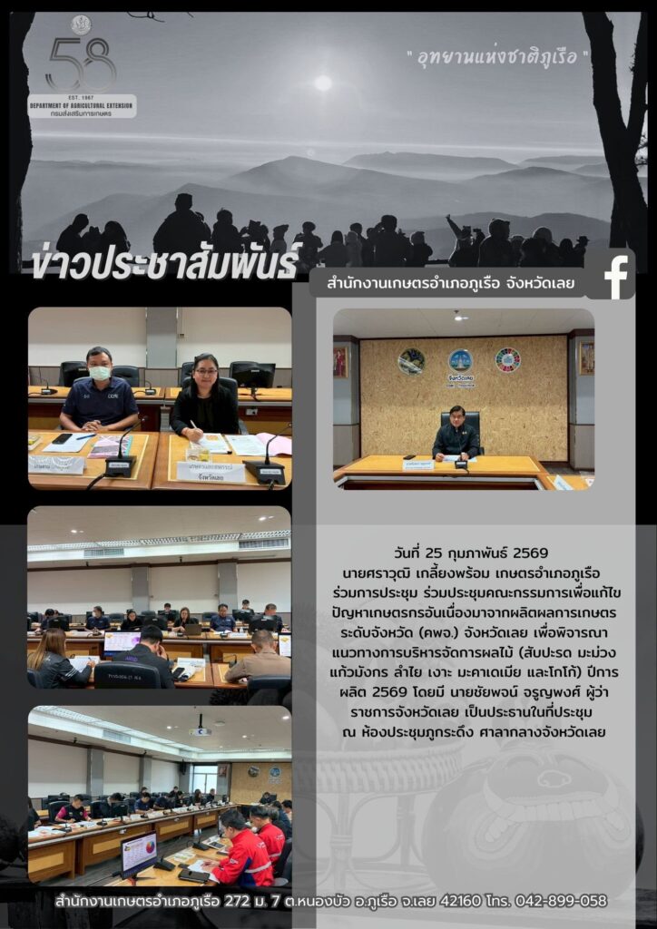 ร่วมการประชุม ร่วมประชุมคณะกรรมการเพื่อแก้ไขปัญหาเกษตรกรอันเนื่องมาจากผลิตผลการเกษตร ระดับจังหวัด (คพจ.) จังหวัดเลย เพื่อพิจารณาแนวทางการบริหารจัดการผลไม้ (สับปะรด มะม่วง แก้วมังกร ลำไย เงาะ มะคาเดเมีย และโกโก้) ปีการผลิต 2569