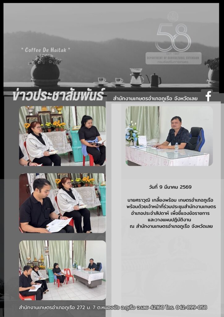 ร่วมประชุมสำนักงานเกษตรอำเภอประจำสัปดาห์ เพื่อชี้แจงข้อราชการและวางแผนปฏิบัติงานBy admin_phuruea / 17 มีนาคม 2026